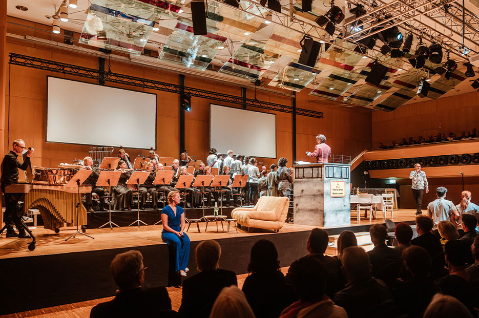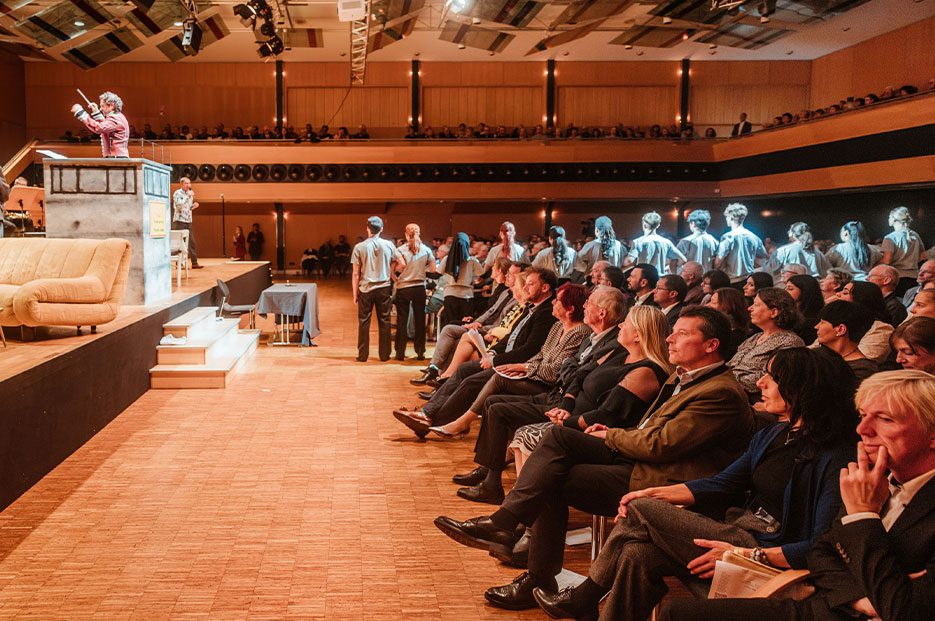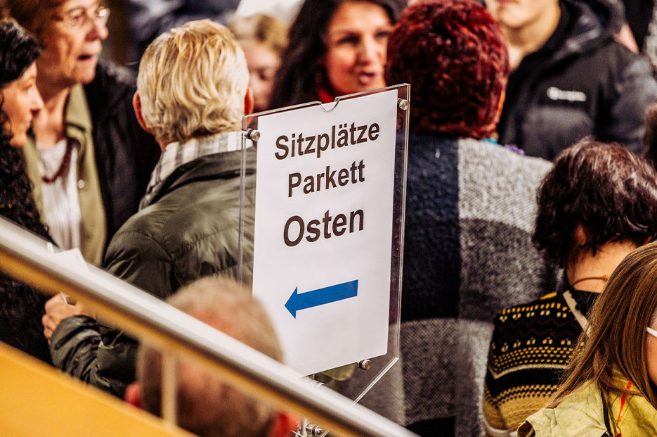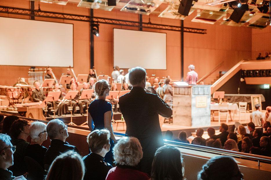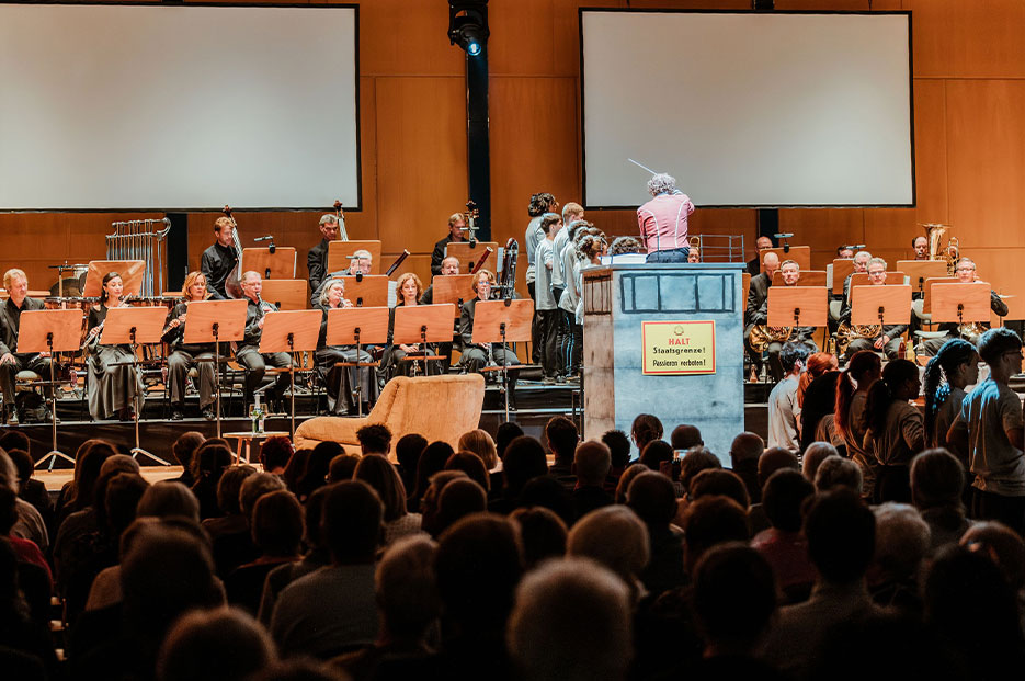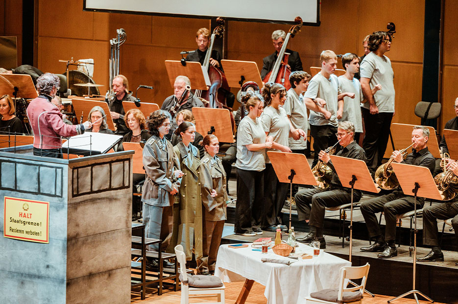 Das Konzert begann bereits mit dem Betreten des Saals. Das Publikum wurde am Einlass in zwei Gruppen aufgeteilt – „Ost“ und „West“. Schauspieler:innen in der Rolle von Grenzposten prüften „Einreisedokumente“, der Zugang erfolgte getrennt. Auch im Saal blieb diese Teilung sichtbar: Eine symbolische Mauer durchzog den Saal, trennte das Orchester und durchschnitt die Publikumsreihen. Auf einem Wachturm über der Mauer dirigierte Jonathan Stockhammer die beiden Hälften des Orchesters.