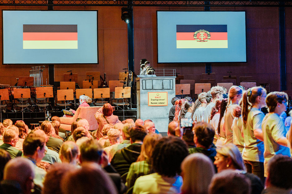 Begleitet von Videoprojektionen mit Archivmaterial – Werbung, TV-Bildern, Propaganda – entstand ein dichtes Stimmungsbild der geteilten Nachkriegsgesellschaften. Zwei Sänger:innen intonierten – unterstützt jeweils vom Ost- oder West-Orchester – Songs aus der Popgeschichte der beiden Deutschlands. Silly traff auf Lindenberg, Pankow auf Geier Sturzflug. In der Verfremdung durch Sprechgesang, Ruf und Choreografie entstand ein ganz eigener, neuer Dialog zwischen den musikalischen Identitäten von Ost und West.